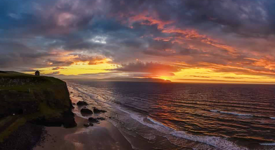 Views over Downhill Beach during sunset with Mussenden Temple visible.